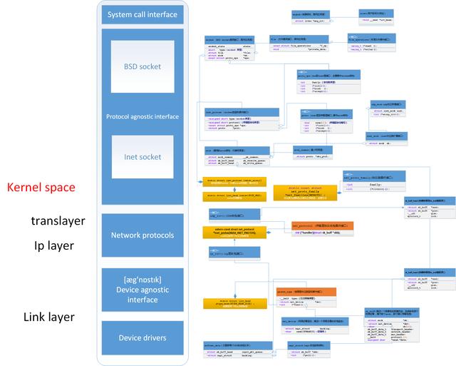 协议无关层(Protocol agnostic interface),又称协议接口层,本质就是 SOCKET 层。这一层的目的是屏蔽网络协议层中诸多类型的网络协议(主要是 TCP 与 UDP 协议,当然也包括 RAW IP, SCTP 等等),以便提供简单而同一的接口给上面的系统调用层调用。简单的说,不管我们应用层使用什么协议,都要通过系统调用接口来建立一个 SOCKET,这个 SOCKET 其实是一个巨大的 sock 结构体,它和下面的网络协议层联系起来,屏蔽了不同的网络协议,通过系统调用接口只把数据部分呈献给应用层。