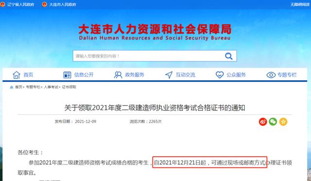 12月9日,辽宁省大连市人力资源和社会保障局发布《关于领取2021年度二级建造师执业资格考试合格证书的通知》,参加2021年度二级建造师资格考试合格的考生,自12月21日起,可以通过现场或邮寄方式领取证书。