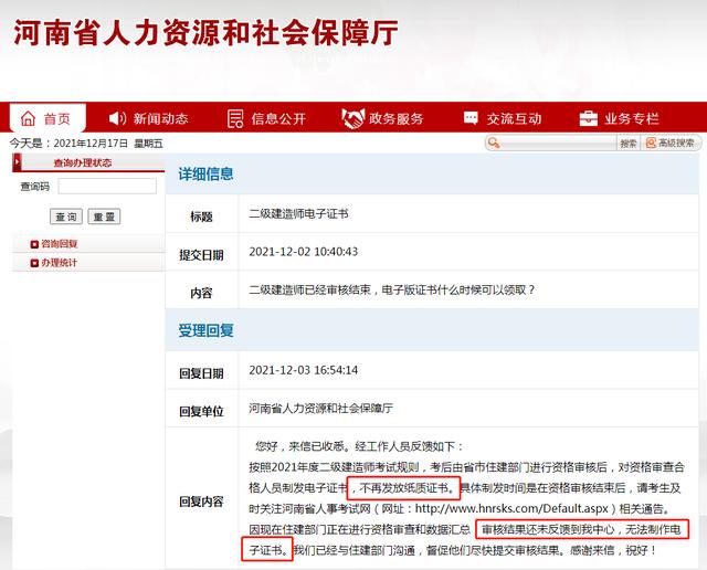 目前,河南省人力资源和社会保障厅还未发布领取二级建造师证书的通知。据了解,在12月2日,河南省人力资源和社会保障厅受理回复二级建造师电子证书领域的问题,回复表示不再发放纸质证书,因目前还未收到审核结果,暂时无法制作电子证书。