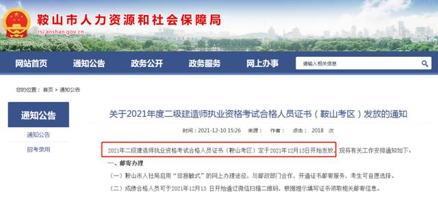 接着,辽宁省鞍山市和葫芦岛市也相继发布了领取二建证书的通知。12月10日,鞍山市人力资源和社会保障局发布《关于2021年度建造师执业资格考试合格人员证书(鞍山考区)发放通知》,2021年二级建造师执业资格考试合格人员证书(鞍山考区)定于2021年12月13日开始发放,可以通过现场或邮寄方式领取证书。
