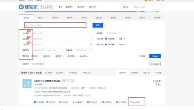 首先我们打开建管家,在搜索框输入公司名称关键词,点击“一键查询”或点击“查企业”,根据需求筛选类别,就可以获得该企业所有信息。