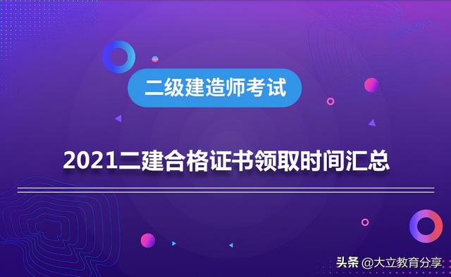 二级建造师证书几时发(二级建造师证书什么时候发) 2021年二级建造师考试合格证书正在陆续发放,为了帮助各位考生及时获取2021年二级建造师考试成绩合格证书领取信息,大立教育为广大考生朋友们整理了2021年全国二级建造师合格证书领取时间及领取通知汇总,供大家参考! 2021年全国二级建造师合格证书领取时间汇总 点击下方链接查看更新地区 各地2021年二级建造师证书领取时间及地点汇总-二级建造师培训-大立教育