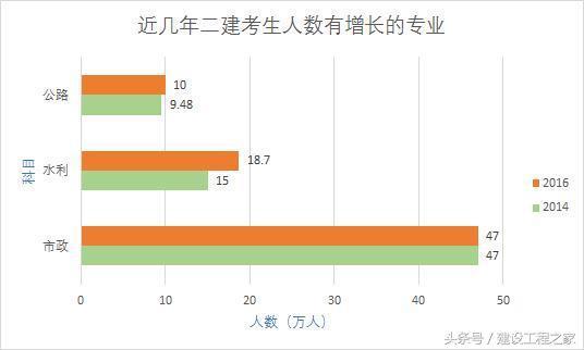 其中二建考生人数有增长的专业有:市政,14年为47万,到16年依然为47万左右,维持原有人数。公路,14年为9.48万,到16年为10万人,略有增长。水利,14年为15万人,到16年为18.7万人有较好增长。