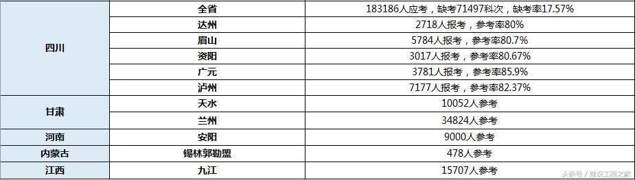 全省2018年应考183186人,计406852科次,缺考71497科次,缺考率17.57%。今年的报考人数逾18万人,居全国第一,创四川省专业技术人员资格考试人数历史新高,较去年增长80%(2017年报考人数为10.6万余人);