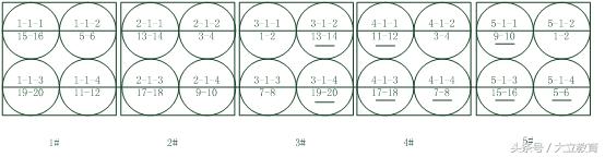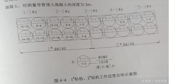 事件一:项目部依据工程地质条件,安排4台反循环钻机同时作业,钻机工作效率(1根桩/2d)。在前12天,完成了桥台的24根桩,后20天要完成10个承台的40根桩。承台施工前项目部对4台钻机作业划分了区域,见图4-3,并提出了要求:①每台钻机完成10根桩;②一座承台只能安排1台钻机作业;③同一承台两桩施工间隙时间为2天。1#钻机工作进度安排及2#钻机部分工作进度安排如图4-4所示。
