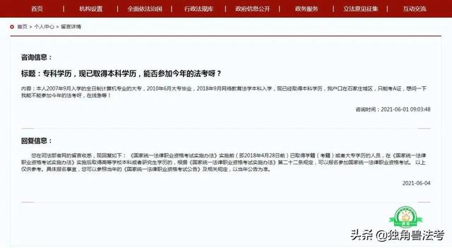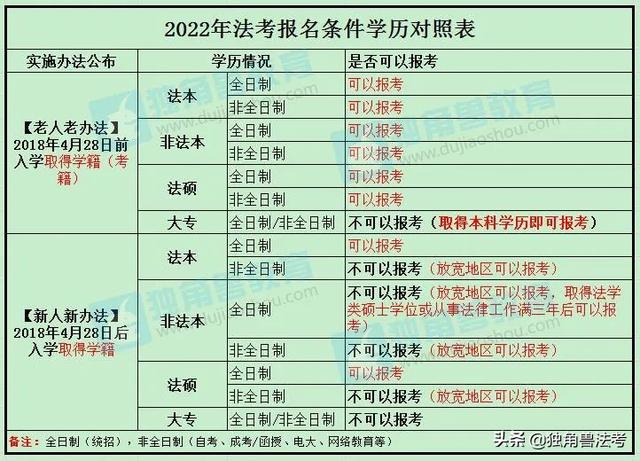 如果2018年4月28日之前入学,就属于“老人”,只要是本科学历就可以考,法本、非法本,全日制(统招),非全日制(自考、成考/函授、电大、网络教育等)都可以报考(必须是本科,专科不行,专科的话需要将学历提升为本科学历才可以报考,下图为司法部官方答复)。