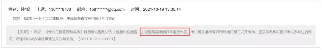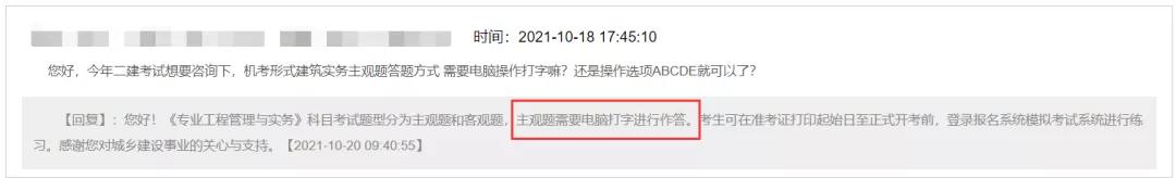 关于机考主观题的方式学员们也是非常的关注,之前有消息说二建机考没有主观题,全部都是客观题;近期云南考生咨询住建厅,答复是:《专业工程管理与实务》科目考试题型分为主观题和客观题,主观题需要电脑打字进行作答!