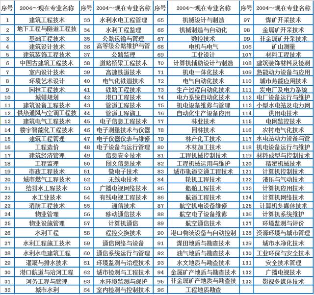 本表按教育部现行《普通高等学校高职高专教育指导性专业目录(2005年版)》编制。共涉及“土建施工类、工程管理类、建筑设计类、城镇规划与管理类、建筑设备类、市政工程类、房地产类、水利工程与管理类、机械设计制造类、自动化类、电子信息类、通讯类、环保类、机电设备类、公路运输类、铁路运输类、港口运输类、管道运输类、林业技术类、城市轨道运输类、水上运输类、民用运输类、资源勘查类、水利水电设备类、地质工程与技术类、矿冶工程类、矿物加工类、测绘类、材料类、能源类、电力技术、计算机类、安全类、广播影视类”等34类133个专业,其中本专业76个,相近专业57个。