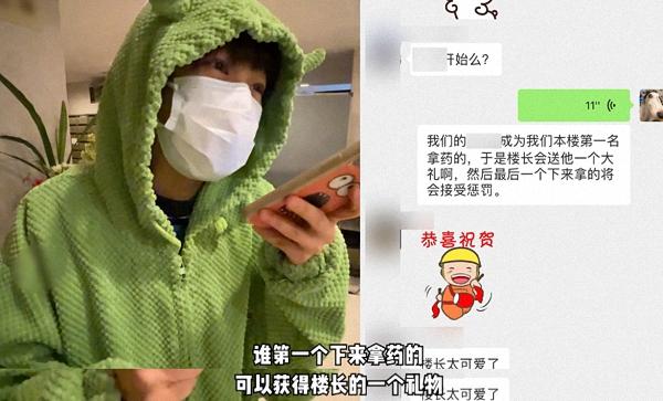 “现在开始下来拿药,谁第一个下来拿药的可以获得楼长的一个礼物。”拉宏桑在楼群里发出消息。第一个下来拿药的阿姨,获得了拉宏桑送出的一个公仔。“好欢乐,楼长好会带气氛”,“下次必须抢第一”,群里的气氛一下热闹起来。