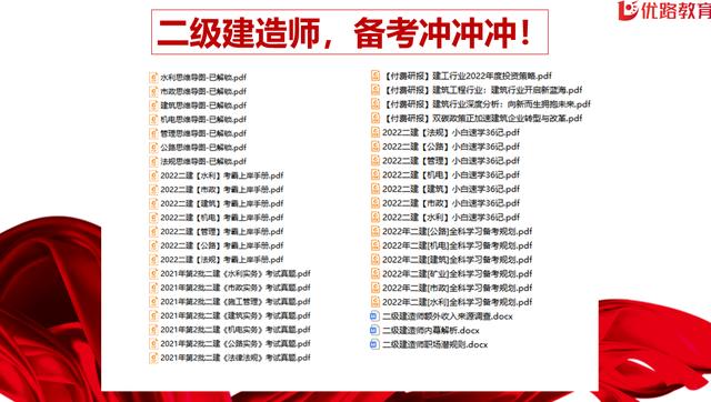 备考是个艰辛的过程,最怕埋头蛮干,闭门造车,这里有小优以多年的经验整理了一份资料,里面包含有《备考规划》、《学习导图》、《历年真题》、《小白速学笔记》、《高频易错题》等知识,内容详尽,关注小优,后台回复“二建”可以免费获取,希望能解决你的备考问题。