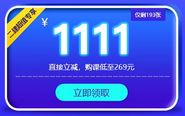 优惠券详情:1111元二建专享包内含超值精品班单科411元优惠券和超值精品班全科700元优惠券,与双十一所有优惠不同享。