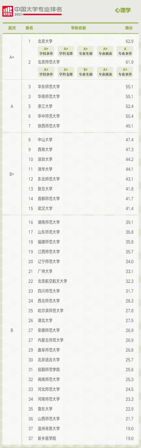 在最新的心理学专业排名中,深圳大学排名第10,广州大学排名第21,是目前华南地区排名最靠前的双非院校。