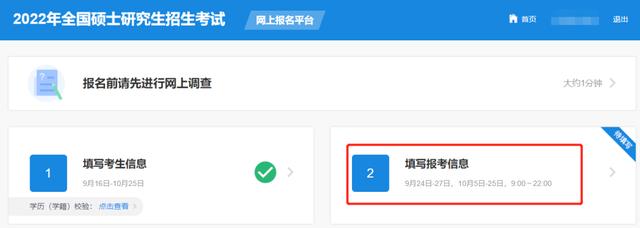 研招网完整报名共分为“填写考生信息”和“填写报考信息”两大步骤。