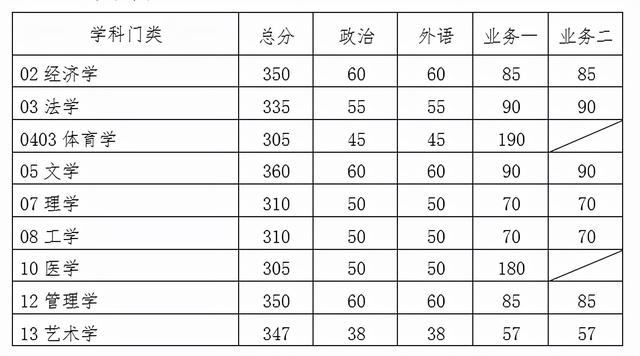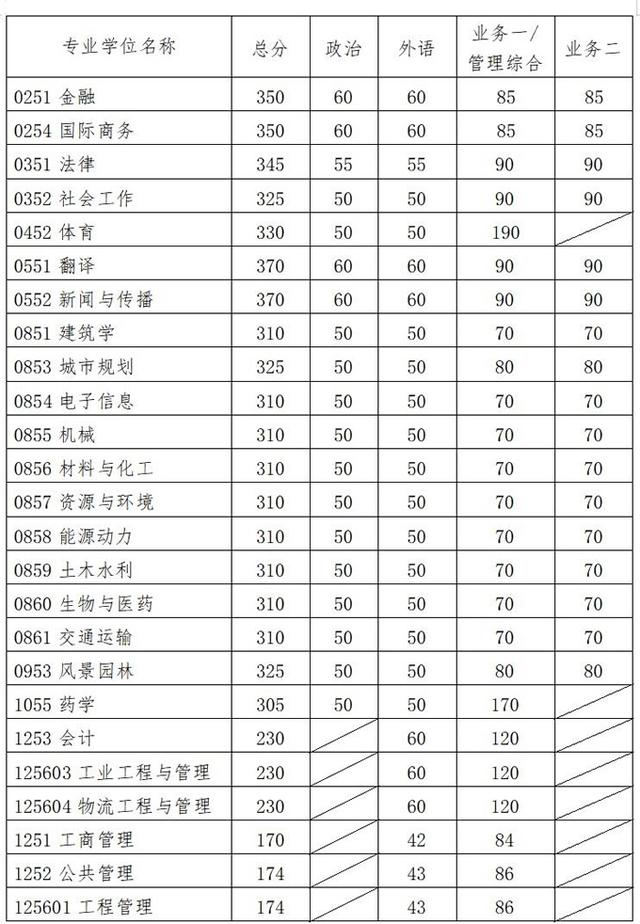 专业学位中,金融专硕、国际商务专硕、法律专硕、城市规划专硕、电子信息专硕、机械、材料与化工、资源与环境、能源动力、土木水利、生物与医药、交通运输、风景园林、药学等专业未变化,社会工作下降15分,体育专硕提高25分,翻译专硕、新闻与传播专硕提高10分,建筑学下降10分,会计专硕提高15分,工业工程与管理、物流工程与管理分别提高10分,工商管理下降5分,公共管理和工程管理各下降1分。