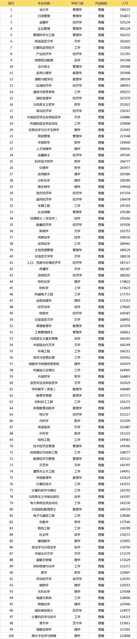 高考的时候,对专业还不了解,也许专业并不适合自己或者专业的就业发展前景不好。考研给同学们提供了一条改变专业的机会,也许就是人生的大改变。所以同学们要抓住机会,理性选择专业和学校。下面君君就带大家看一下考研专业人气排行榜。