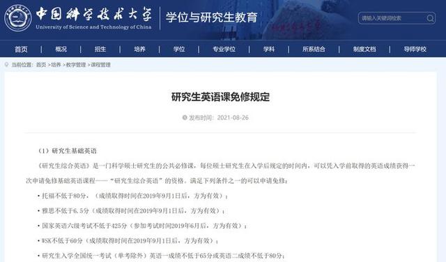 以中国科学技术大学《研究生英语课免修规定》为例[1],研究生入学全国统一考试(单考除外)英语一成绩不低于65分或英语二成绩不低于80分即可申请免修。