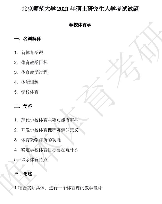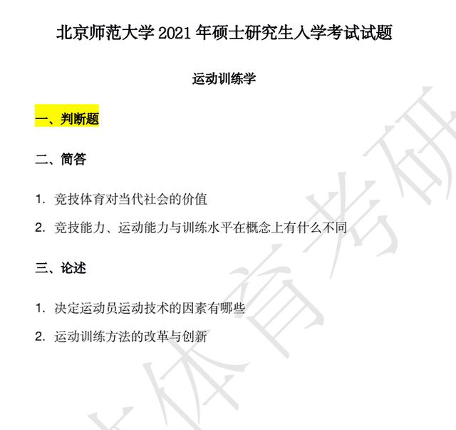 本期真题 北京师范大学 346-体育综合考研真题(2021年) 真题部分截图如下,高清版本支持打印~~~ 领取详情可关注我们的微信公众号“唯体体育考研”,详见公众号推文!!! 有任何关于体育考研的问题欢迎大家给小编留言,小编会及时回复大家,不要着急哦!