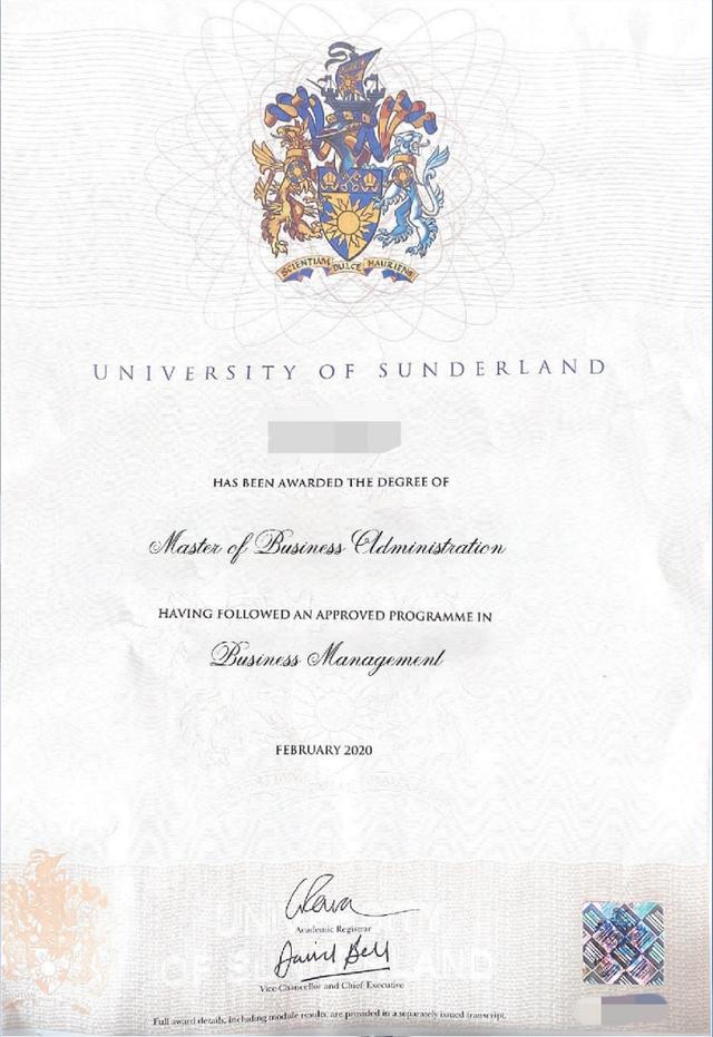 桑德兰大学证书样本