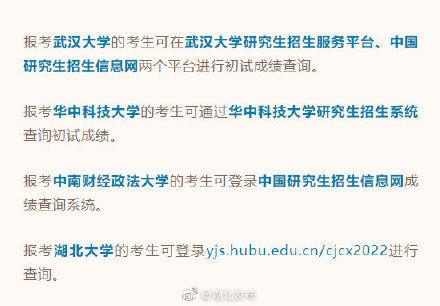 2. 成绩公布及查询办法:湖北省2022年全国硕士研究生招生考试(初试)成绩由各招生单位公布,查询办法请见各招生单位公告。