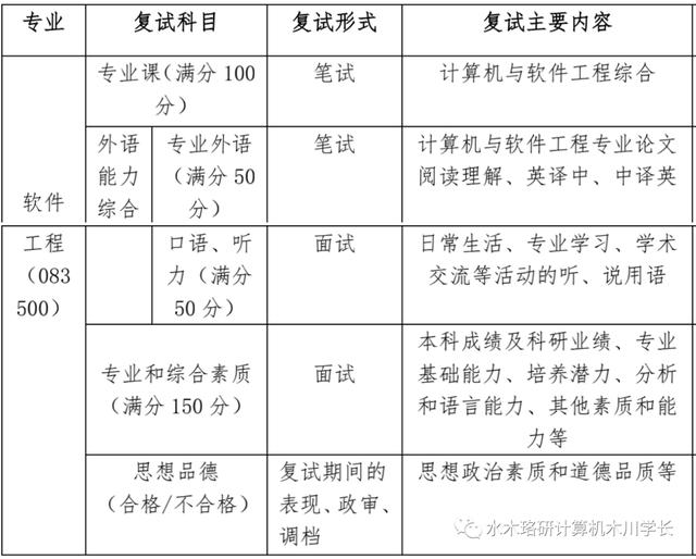 复试内容包括:专业课(笔试,100 分,其中计算机科学与技术/电子信息(计算机与智能技术)的专业课分数中,机试编程占 40%)、外语听力与口语(口试,50 分)、专业外语(笔试,50 分)、专业综合(口试,150 分),合计 350 分。