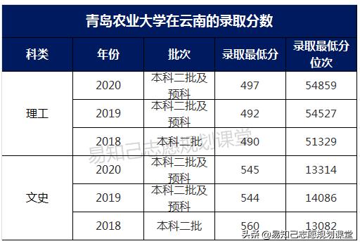 青岛农业大学2020年在云南的招生,理科录取最低分是497分,比一本线低了38分;文科录取最低分数545分,仅比一本线低了10分。