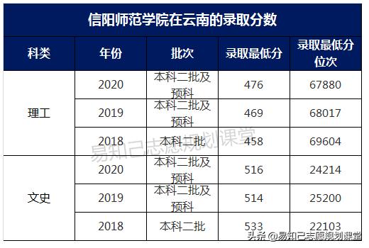 信阳师范学院在云南的理科录取分不算高,2020年理科录取最低分476分,比一本线低了69分!文科录取最低分516分,比一本线低了39分!