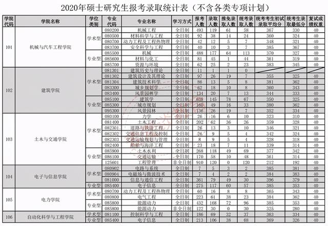 下表汇总了去年(2020年)华南理工大学硕士研究生招考各学院内各专业的报考人数,总录取人数,统考录取人数,推免生人数,统考录取平均分/最低分。