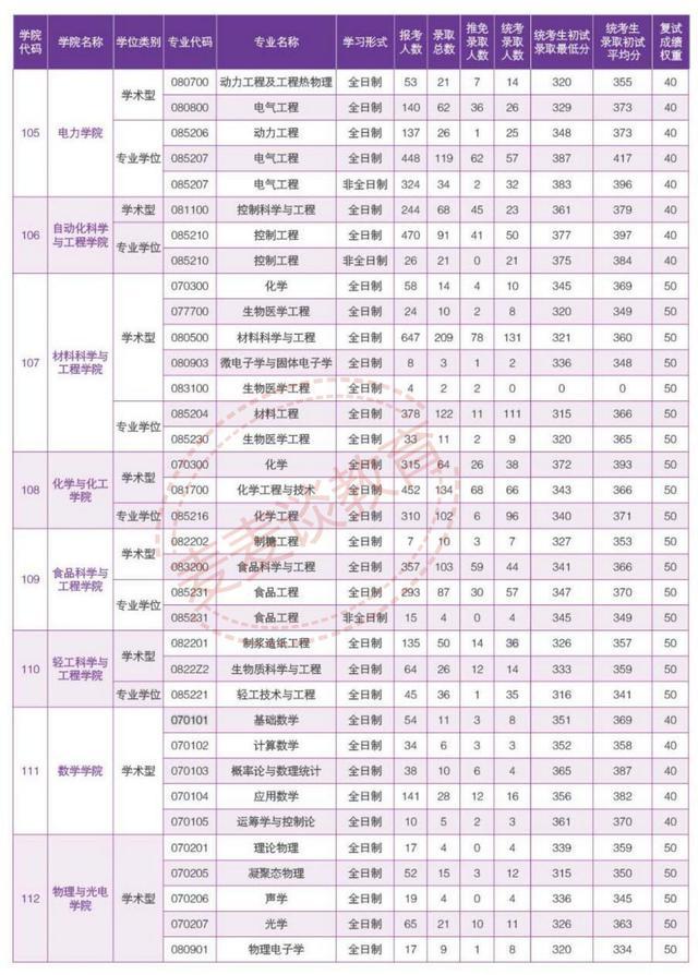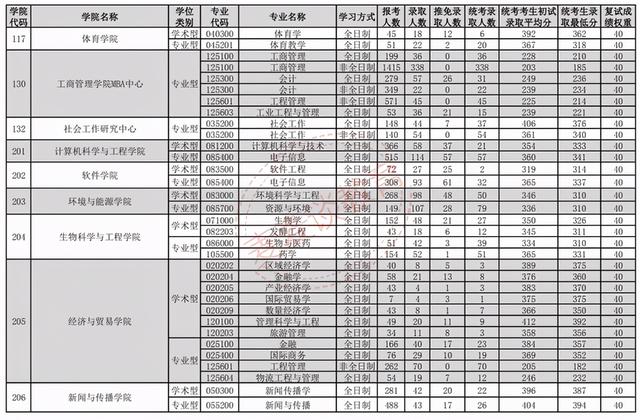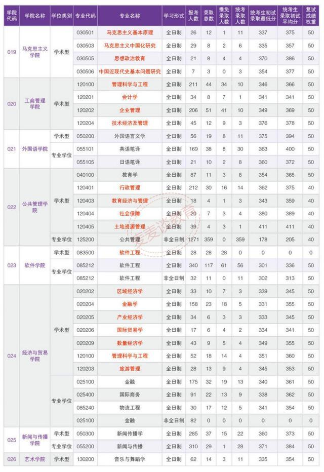 2019年全日制,非全日制各专业专硕/学硕,统考录取最低分/平均分,以及报名人数及录取人数情况如下表。2019年各专业复试成绩权重比例各专业略有不同,分别由占比40%,45%,50%不同计算模式,请注意区分。