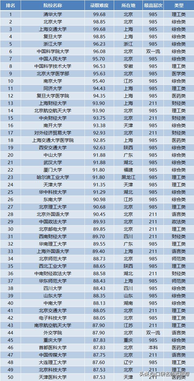 从TOP50排名榜单来看,最难考的依旧是是北京大学和清华大学,一方面这两所高校是我国的顶级高校,另一方面是保送生比例高,北大清华的保送研究生生源质量也是很高的。