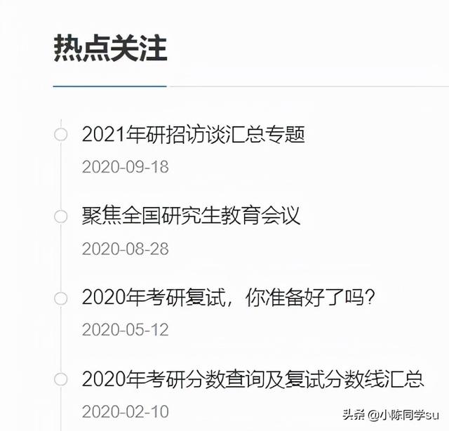 查找复试分数线:仍进入研招网中国研究生招生信息网,找到网站首页中部右方「热点关注」,往下翻,点击「2020考研分数查询及复试分数线汇总」。
