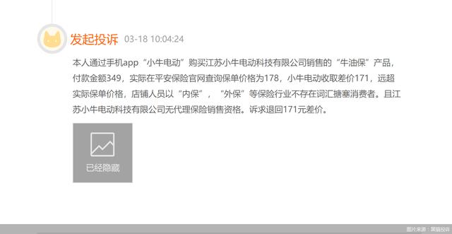 比如,3月,一位消费者投诉表示:本人通过手机App“小牛电动”购买了小牛电动销售的“牛油保”产品,付款金额349元,实际在保险官网查询保单价格为178元,小牛电动收取差价171元,远超实际保单价格,店铺人员以“内保”“外保”等保险行业不存在词汇搪塞消费者。6月,亦有消费者在黑猫投诉表示:小牛电动实体店引导购买的“牛油保”至尊PLUS价格为538元,保单价格只有238元。两者保单内容完全一致,价格差异巨大,涉嫌价格欺诈,要求退还差价300元。