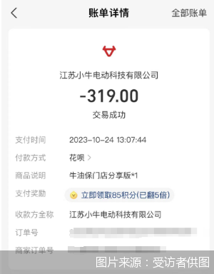 根据王欣欣提供的支付凭证,北京商报记者发现,这笔保费确实为319元,收款方为“江苏小牛电动科技有限公司”,商品说明为“牛油保门店分享版*1”。