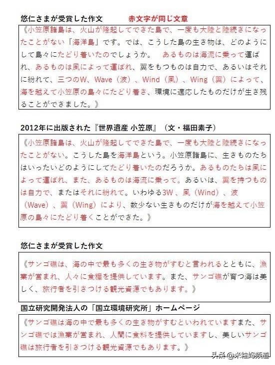 紧接着又有人扒出,悠仁的获奖作文《小笠原群岛访问记》涉嫌大量抄袭。这本是一篇写自己陪父母参观小笠原群岛的游记,结果大家发现,里面大量的段落抄袭了2012年出版的《世界遗产小笠原》。