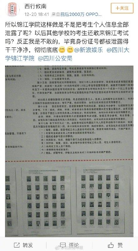 【四川高校回应“大展板张贴考研生个人信息”:为方便考生迅速找到考场】近日,有网友反映,四川大学锦江学院将2019年全国硕士研究生招生统一考试的考生信息包括姓名、照片、身份证号等展示在展板上,放于学校门口位置,担心这种做法会泄露考生个人信息。12月21日,校方回应称,此举是为了方便考生迅速找到对应的考场。该校宣传部一工作人员称,展板上除了考生的个人信息,还有考生对应的考场信息及必须告知考生的考试纪律,“因为有些考生不是我们学院的,对学校不熟悉,怕他们找不到考场,就把张贴在每个考室门口的考生信息再次集中起来,放在考生进校门后到考场的必经之路。”工作人员称,此前也未接到考生反映此举可能泄露个人信息,但注意到网友在网上的反映后,校方也向主管部门汇报了相关情况,“这么做也没说不可以”。同时,北青报记者也以考生身份致电四川省教育考试院咨询此举是否符合相关规定,工作人员并未给出明确答复,并表示,在开展硕士研究生考试的工作中,对于考生信息的核对,不同考点有不同处理方式。(北青报记者 李涛 实习生 戴幼卿)