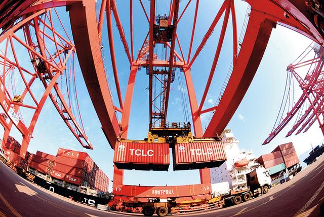 江苏连云港港口码头,集装箱被起吊、装运(2021年12月7日摄) 耿玉和摄/本刊