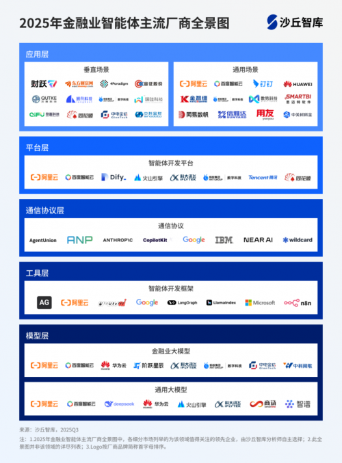 沙丘智库最新发布《2025年金融业智能体主流厂商市场指南》,这份报告通过多家厂商的调研,从产品成熟度、行业落地深度不同的维度进行评价,筛选出各个细分市场的领先企业。当中在应用层使用较多的有垂直场景–财跃和通用场景–金智维。