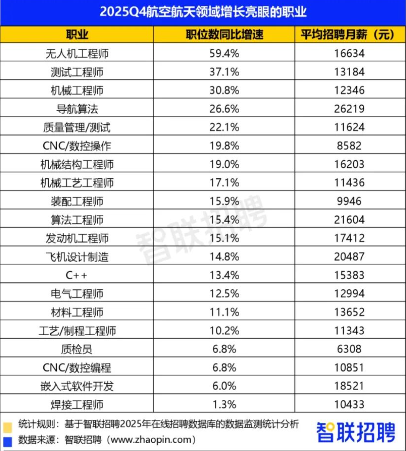 导航算法、算法工程师等人才对企业的吸引力增加,平均招聘月薪具有一定竞争力,此类岗位集中在导航系统、飞行控制系统、仿真控制等高技术环节,是薪酬较高的职业群体。此外,低空经济的发展也保持活跃,无人机工程师四季度招聘同比增长显著,增速突出。随着无人机在巡检、安防、农业等领域的应用扩大,低空领域开发工程师、算法工程师等岗位需求将逐步扩大。