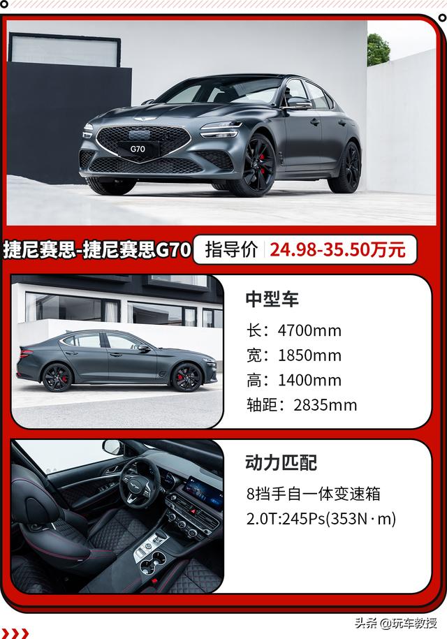 几个月后,又推出一款定位更低、售价更低的中型轿车捷尼赛思G70,该车售价区间为24.98-35.50万元,比二线豪华品牌中的凯迪拉克CT5、沃尔沃S60售价门槛更低,同时全系搭载2.0T发动机,匹配8速手自一体变速箱,并采用前置后驱或四驱的布局形式,且配置也是入门即高配,诚意满满。
