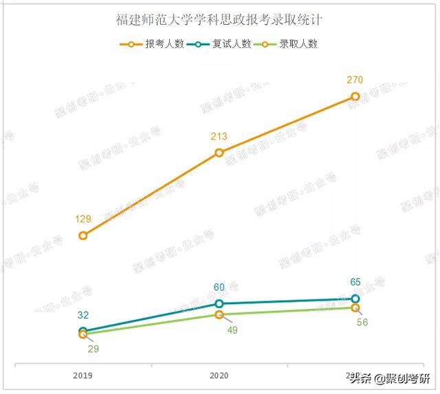 从近三年报考录取情况,可以直观的发现,福建师范大学学科教学思政的报考人数与录取人数均呈现不断上升趋势,其中报考人数上涨明显,基本以每年五六十的人数上涨,录取人数增长相对平缓,整体报考人数增长幅度超过录取人数增长幅度,报考难度呈现逐年上升趋势。
