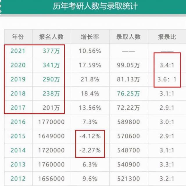 根据数据统计,即使每年的考研人数都在增长,2021年报名人数已达377万,但是考研的上岸比率依旧大概是3:1的状况,每三个人里,只有一个人可以成功被录取。