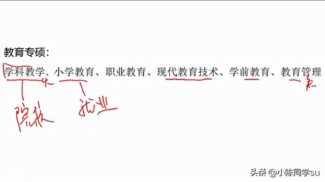 比如说,职业到专业我举个例子,想进教育圈同学们,我们拿专硕举例。这些专业,学科教学、小学教育、职业教育、现代教育技术、学前教育、教育管理都能帮您进教育圈。但是它有什么样的不一样,学科教学最火,小学教育其次,现代教育技术主要做的是类似于学校的多媒体类的工作,所以我们工科的同学是可以跳这个专业,教育管理是需要有一定经验。在你具体看的时候,你还有可能有一些误区。我给你举个例子,有没有想当美术老师的同学,想报学科美术。想当美术老师的同学们如果你要报学科教学美术专业,你会发现两个事,第一个专业的招生学校很少,这还不是最可怕,最可怕的是如果您是想进事业单位进公立学校,您毕业之后得考编。考编那会更可怕,因为学校不要那么多美术老师,两三百个人竞争一个考编的美术老师一点不夸张。所以在看了哪些专业之后,后边可能还有坑。第一步总之是,要从行业看到专业。