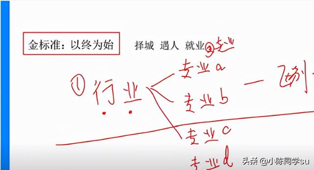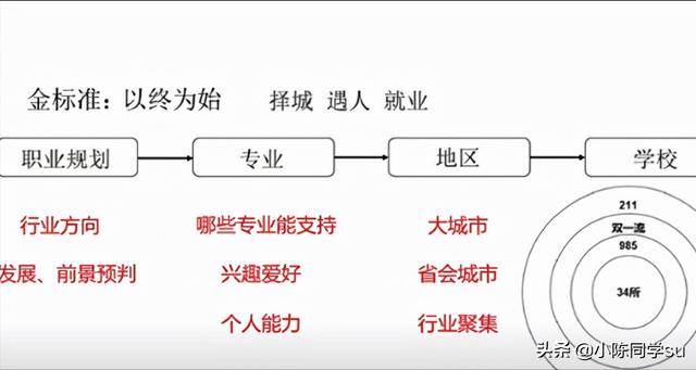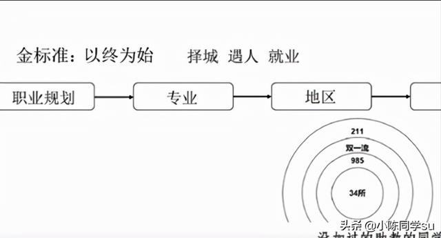 我们把这三块扔到一块来说,专业、地区和院校我们放到一块来说,你是一个什么样的标准?你们记住哥这句话,这句话帮你一辈子的,“以终为始”。我们有一些事情在你理性做选择的时候,你的所有的原则都叫以终为始,当然不是所有的选择都要理性做的。我给您举个例子,比如说我谈恋爱这件事情一定要理性做。比如说我择校择专业,有同学他也不理性,给你们举个例子比如说我上回跟孩子聊,这孩子跟我说他要考北大比较文学,他现在是一个双非,他要考北大的比较文学,我当时问他这是为什么呢?他非要我不接受别的,我问他为什么?他跟我说因为我们家亲戚住在北大边上,我说好我懂了。然后我问他,我说你现在你考北大肯定有风险,你到底能付出什么?他说我能付出所有的时间,我心想完蛋了,这事就从根本上没想明白。