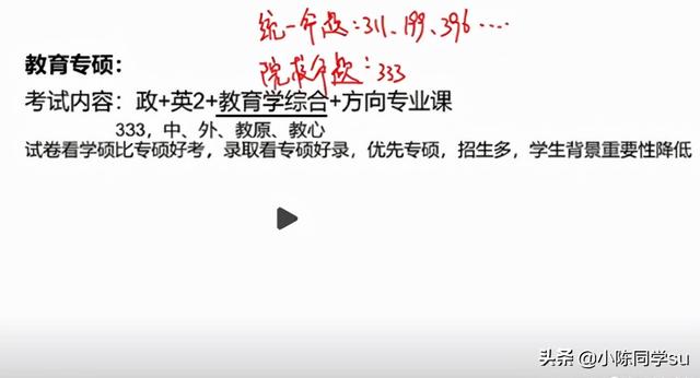 我给大家教育专硕举个例子,比如说那些想进教育圈的,我们说了教育专硕,刚才不是说了学科教育,小学教育等等。考政治,英二,教育学综合,教育学综合的编号叫333加方向类的专业课。专业课有两类,一类是统一命题的,统一命题大家能理解,就是我不管考哪个学校,只要考这个东西卷子都一样,这就叫统一命题的专业课,比如说311,我们考教育学学硕的同学,你会考一门课程叫教育学专业基础综合编号311。比如说我们考管理学专硕的同学通常会考一个科目叫199管综。这些都是统一命题的。但是除此之外还有一些院校命题的专业课,就大多数其实是院校命题的专业课,大家就能理解了,不同的学校考的不一样,一个学校不同的学院考的都可能不一样,比如说教育学综合333。都叫333为什么考的不一样?其实很能理解。你吃蛋炒饭到哪都是鸡蛋加米饭,但每个地方炒的就是不一样,就这个道理。所以所有的333都有一个大纲,但是在大纲的基础之上,学校可以根据大纲自主命题,去自主选择我的参考书到底是什么,这会说到参考书,我这儿稍微多说一嘴。参考书这个事你是能够通过它来判断一下你对这个学科是不是真的感兴趣的。大家刚才全都提到说是不是感兴趣?你怎么样判断,除了觉得名字时髦之外,你真的要把参考书买回来看一看,看看你是不是看了下去是不是喜欢。