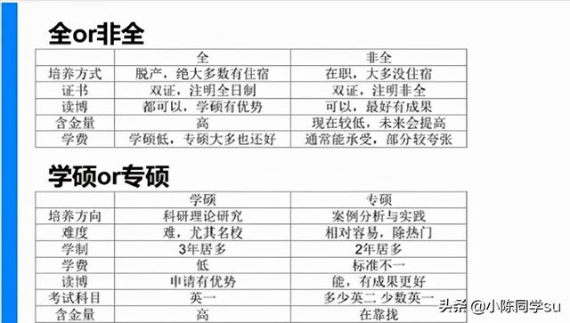 第一个硕士类别,这一页大家都能看懂。我们有在职同学,在职的朋友们考研非常不容易。一边上着班一边考着研,还得自己偷偷考,们非常敬佩。首先我们在职的朋友们,您可能会有一些生活上的压力,可能养娃可能养爹妈,所以您可能会考虑说我们能不能一边上班一边读研。有种研究生叫非全日制研究生,简称非全。非全我只说两点,第一点非全日制研究生拿的也是双证,毕业证加学历证,是正经的学历教育。但是您的身份证上会写您是非全日制研究生,所以它的含金量相对来讲是比较低的。既然含金量比较低,所以考非全的同学就建议大家考名校,如果是普通学校的非全就不建议了。第二个想说的是关于非全的学费问题,比如说有没有想考考应心的同学,应用心理学第一梯队的北师大,北师大的应心除了学学硕之外,只有非全。非全学费,两年20-24万之间,也就是说一个月1万块钱。所以考非全同学您需要关注这两点一含金量二学费。