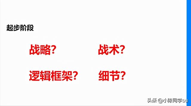 但是我想问同学们来你告诉我,我们在最开始的起步阶段,你觉得在这个阶段是这个东西更重要,是框架和逻辑更重要,还是我的细节更重要?是战略更重要还是战术更重要?我一问大家都知道,显然是框架逻辑更重要。我们在准备一个事之前,不管是择校做专业还是学习,任何事都一样,在最开始起步阶段,显然是战略更重要,逻辑框架更重要。所以一问你们都明白,但是你们就容易一上来就陷入细节里,你就开始大海捞针,你根本就捞不着。