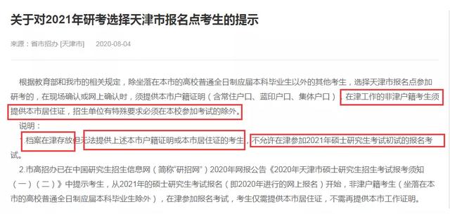 除本市的高校普通全日制应届本科毕业生以外的其他考生,选择天津市报名点参加研考的,在现场确认或网上确认时,须提供本市户籍证明(含常住户口、蓝印户口、集体户口),在津工作的非津户籍考生须提供本市居住证,招生单位有特殊要求必须在本校参加考试的除外。