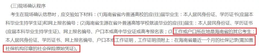 工作或户口所在地是海南省的其它考生:本人居民身份证、学历证书、网上报名编号、户口本或工作证明,工作证明须附上:在海南省最近一个月的社保记录(需加盖社保机构印章的社会保险原始凭证)。