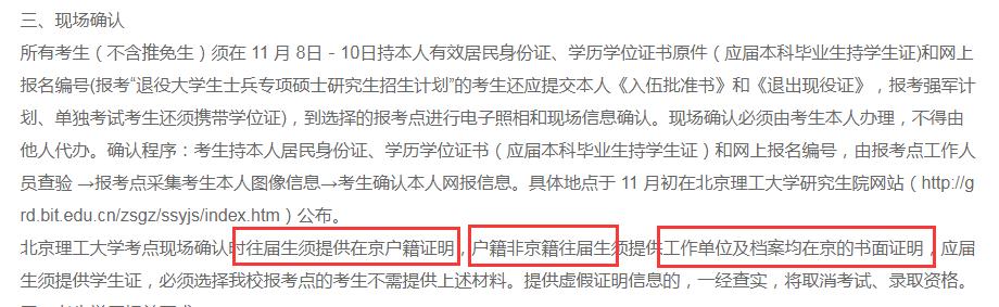 以北京理工大学为例,考点现场确认时往届生须提供在京户籍证明,户籍非京籍考生须提供工作单位及档案均在京的书面证明,应届生须提供京籍高校学生证,必须选择我校报考点的考生不需提供上述材料。提供虚假证明信息的,一经查实,将取消考试、录取资格。
