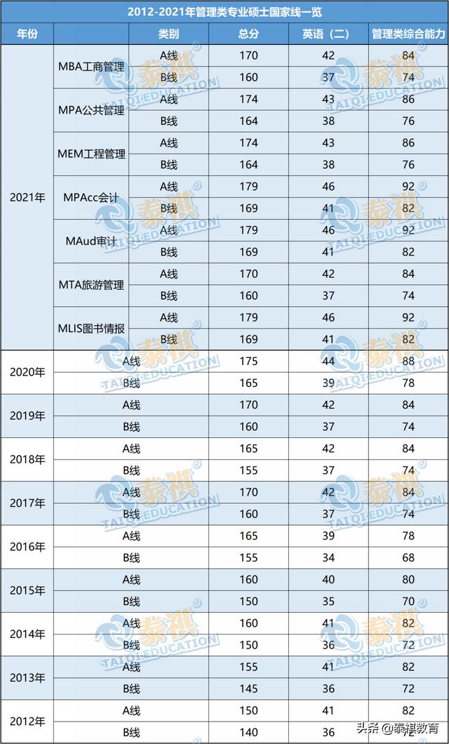 近十年管理类研究生各专业的国家线,见下表: