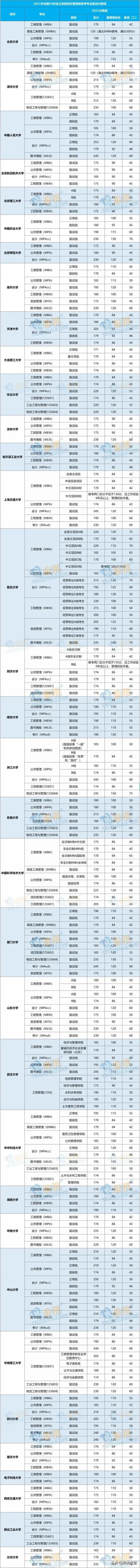 大家查询到初试成绩后,可以根据往年分数线预估是否能进入复试。下面是2021年34所自划线院校管理类专硕的复试分数线,供大家参考了解。